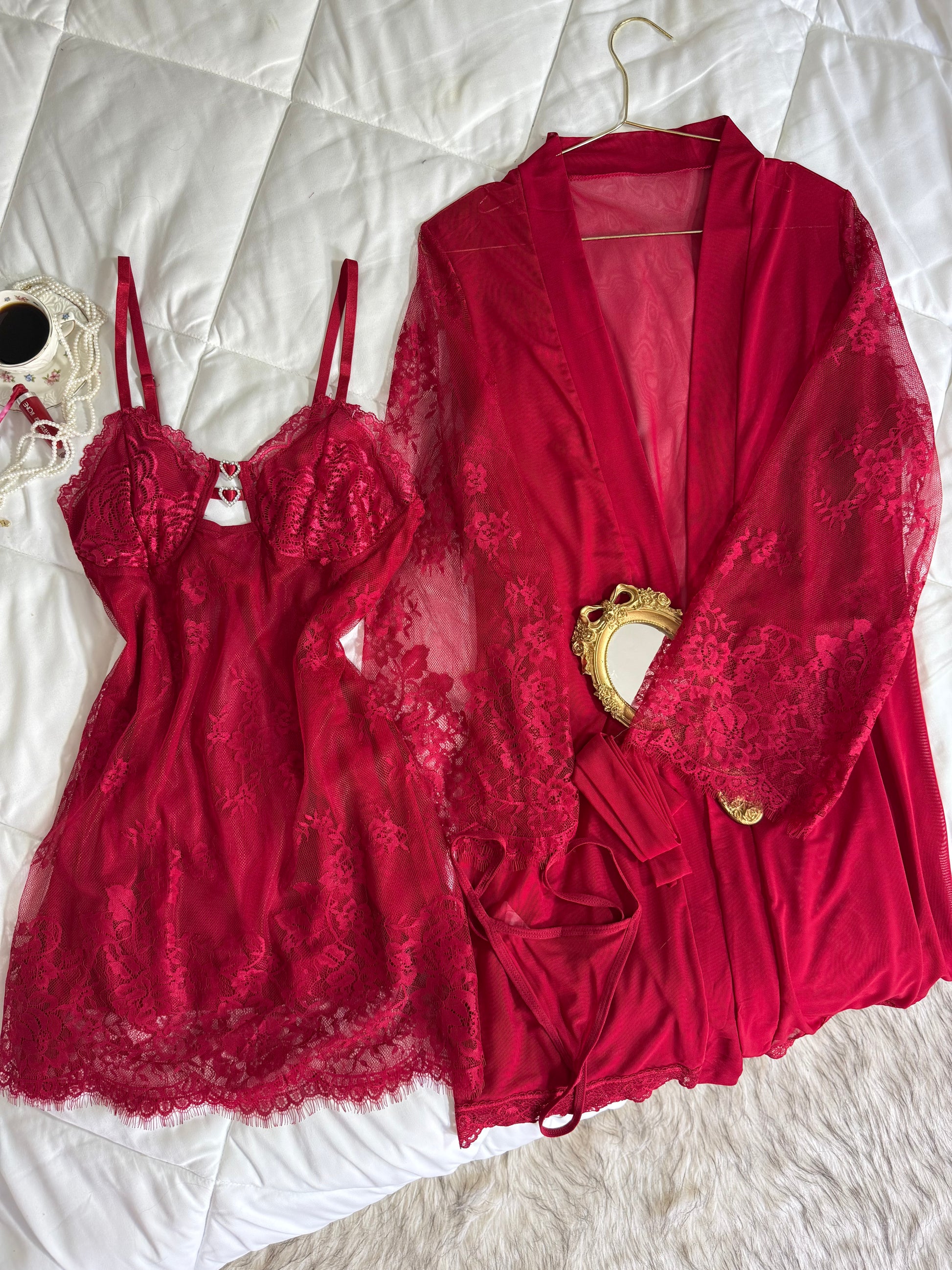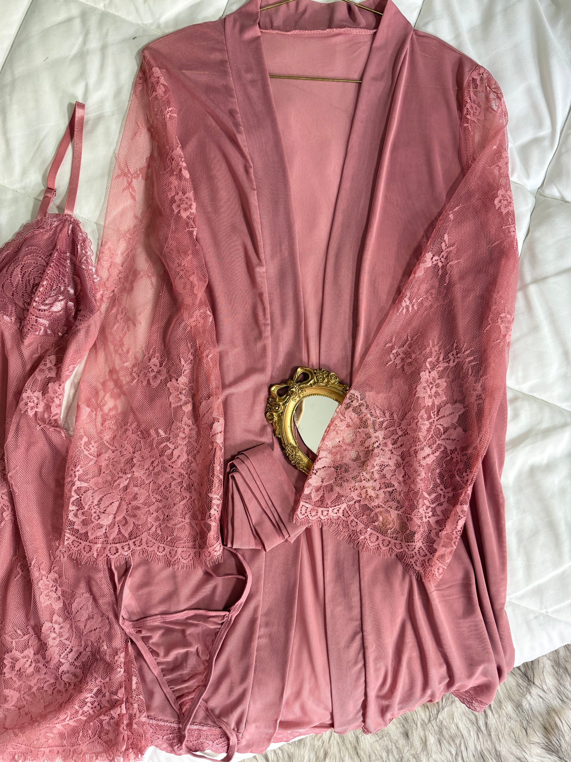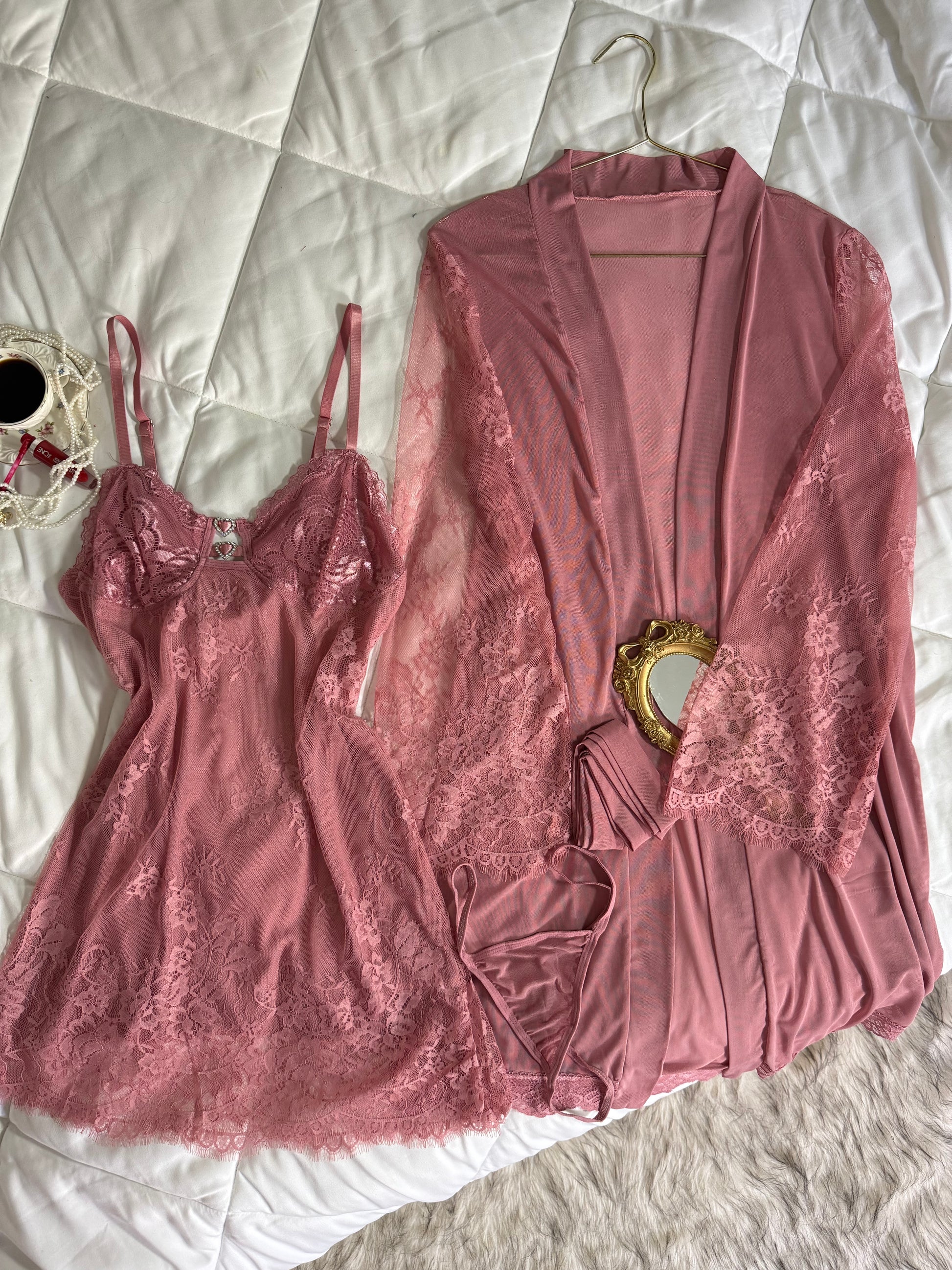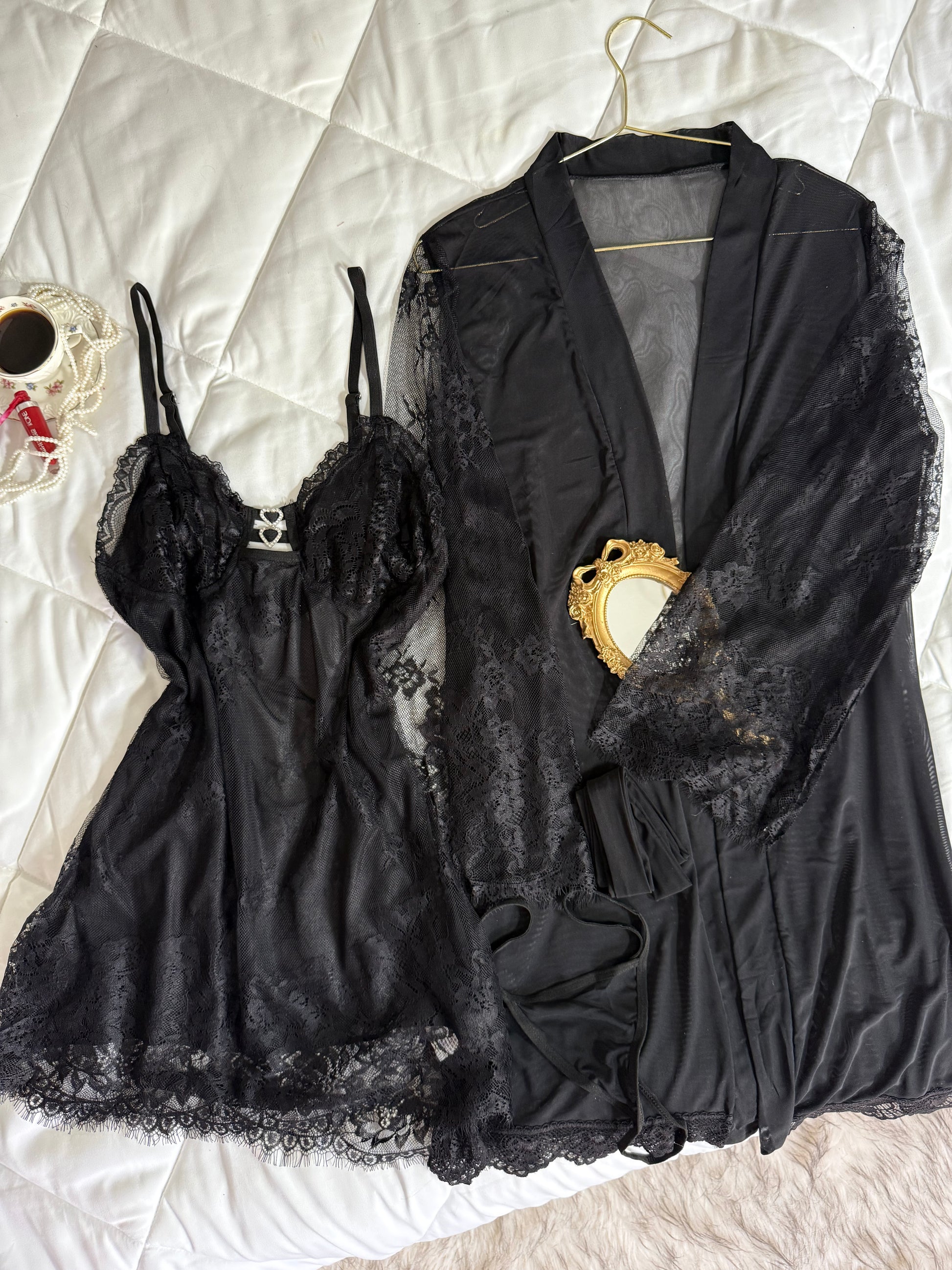 Composé d’un kimono léger, d’une lingerie délicate et d’un bas assorti.